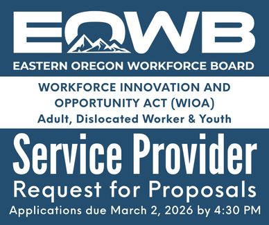 The Eastern Oregon Workforce Board (EOWB) is soliciting proposals for the delivery of services under the Workforce Innovation and Opportunity Act (WIOA) Title I Adult, Dislocated Worker, and Youth programs in its entire eight-county area, which includes Baker, Grant, Harney, Malheur, Morrow, Umatilla, Union, and Wallowa counties.
